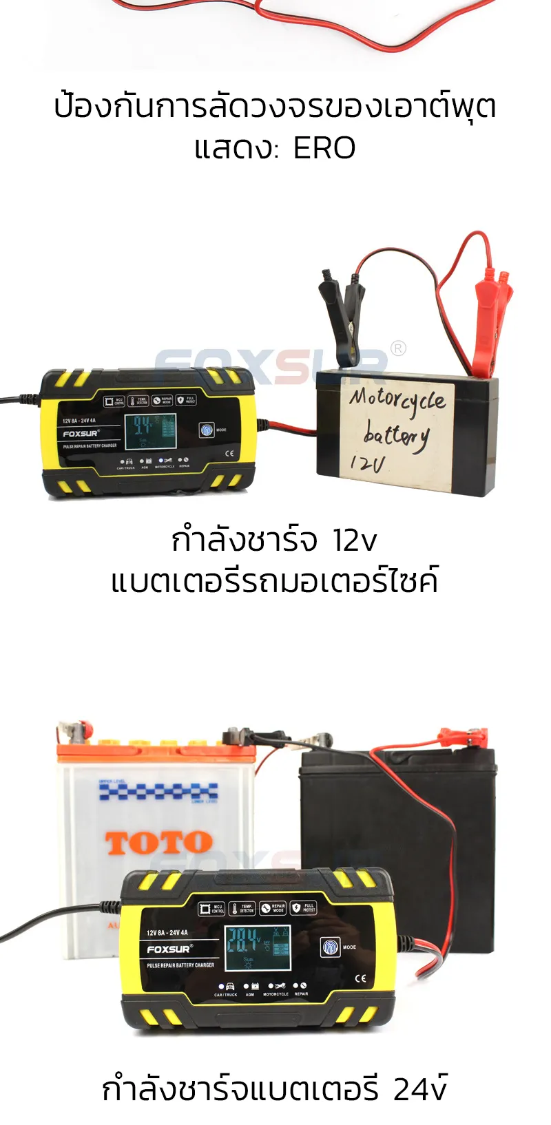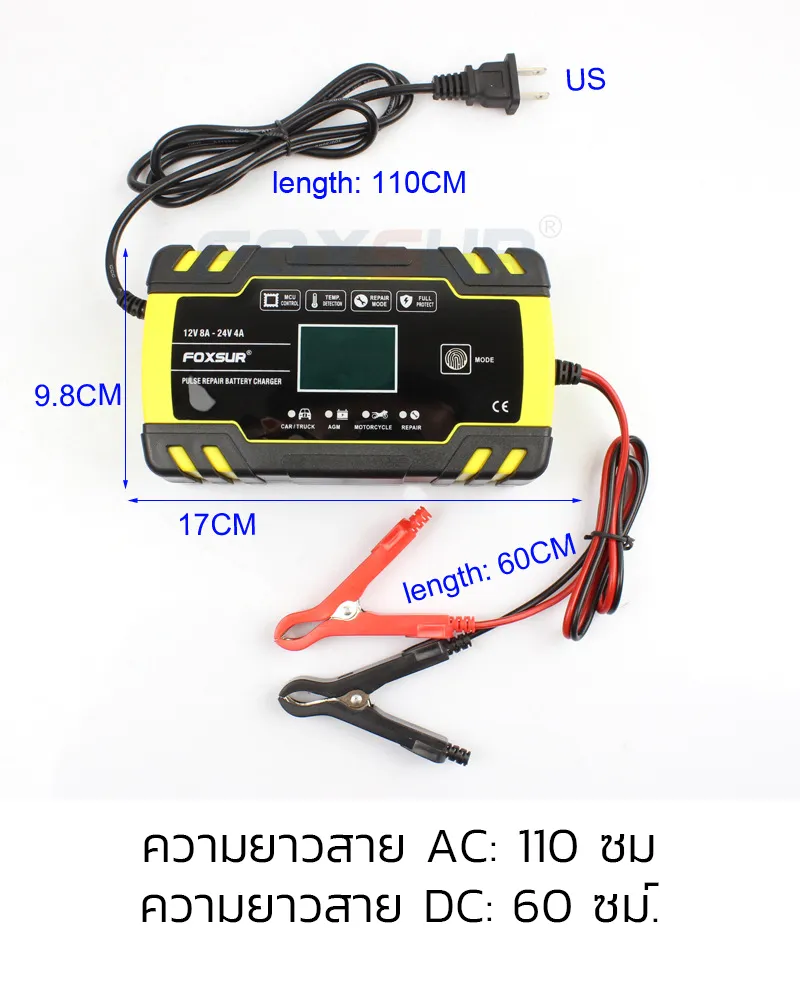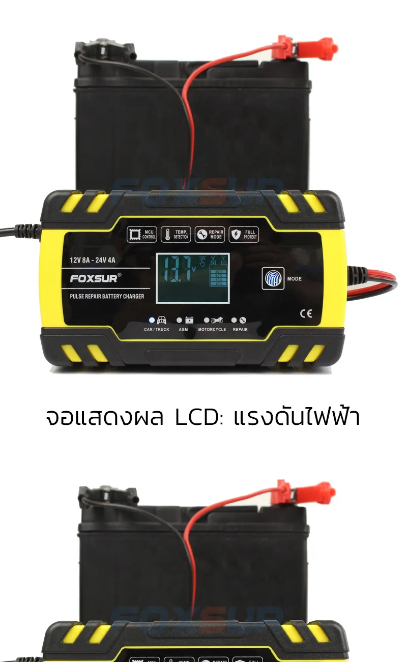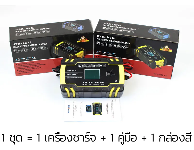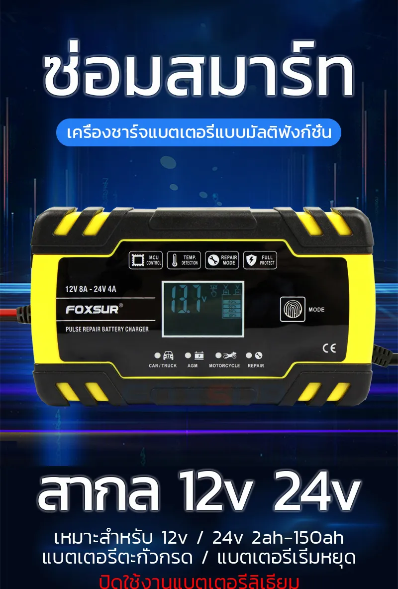 FOXSUR FBC122408D Car Battery Charger เครื่องชาร์จแบตเตอรี่อัจฉริยะ Pulse Repair Charger เครื่องชาร์จแบตเตอรี่ 12V 24V เครื่องซ่อมแบตเตอรี่ รถยนต์ รถมอเตอร์ไซค์