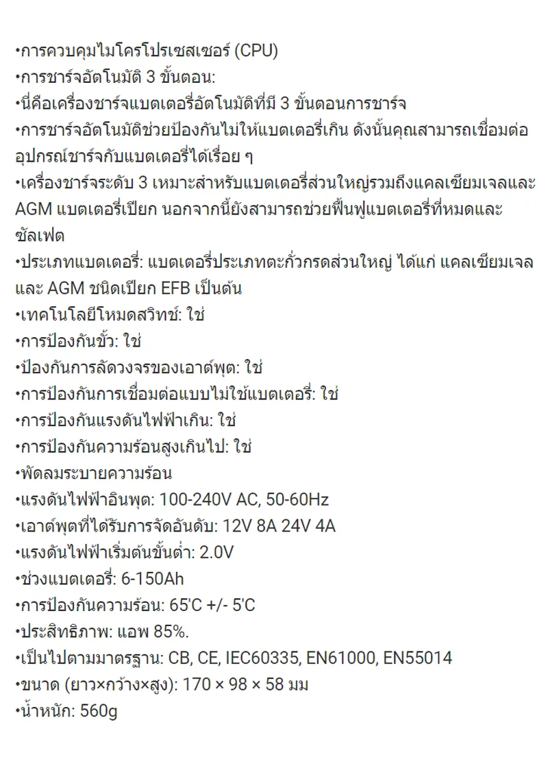- รองรับแบตเตอรี่ชนิด แบบแห้ง แบบกึ่งแห้ง แบบน้ำ แบบ maintennance-free
