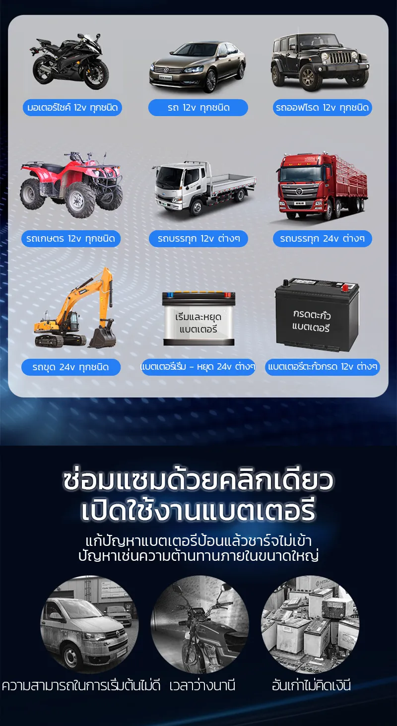 - มี 4โหมดการทำงาน CAR/TRUCK,AGM , MOTORCYCLE , REPAIR ให้ผู้ใช้เลือกตามต้องการ