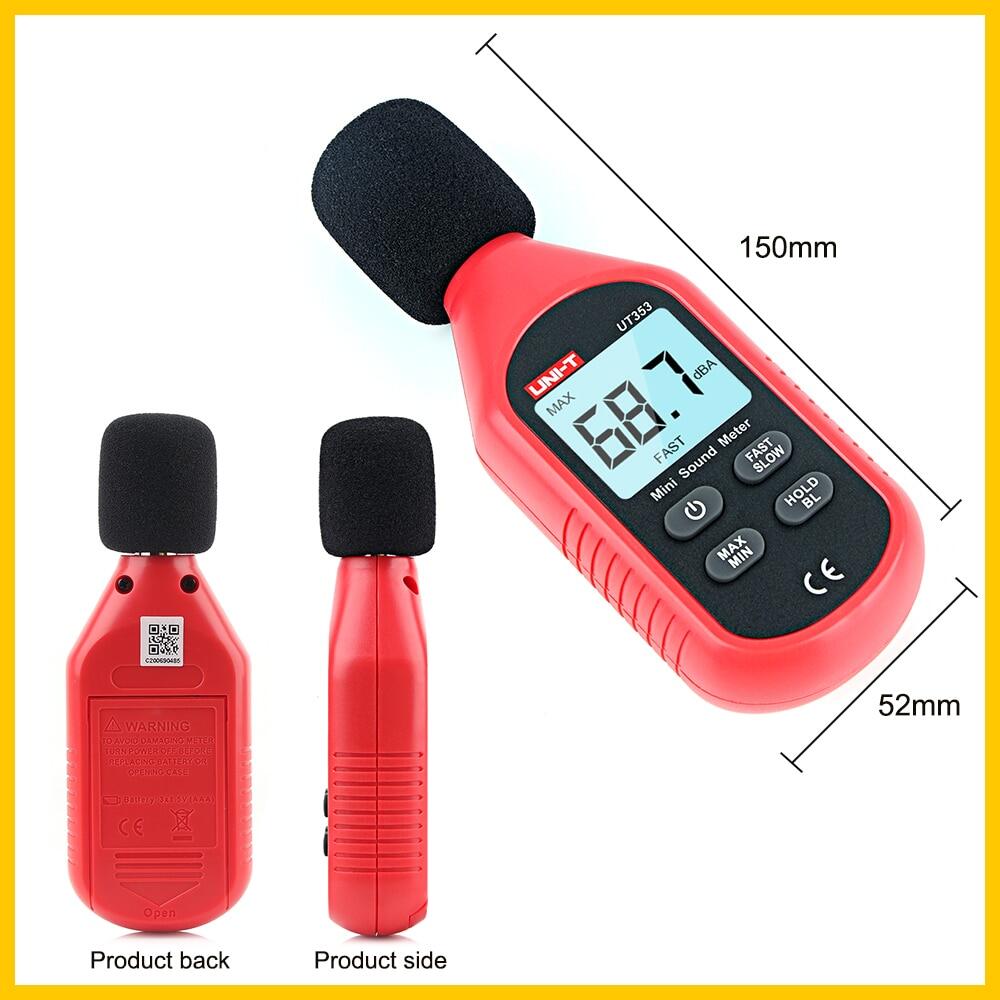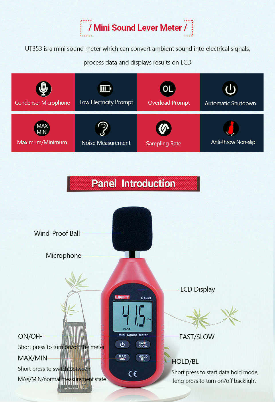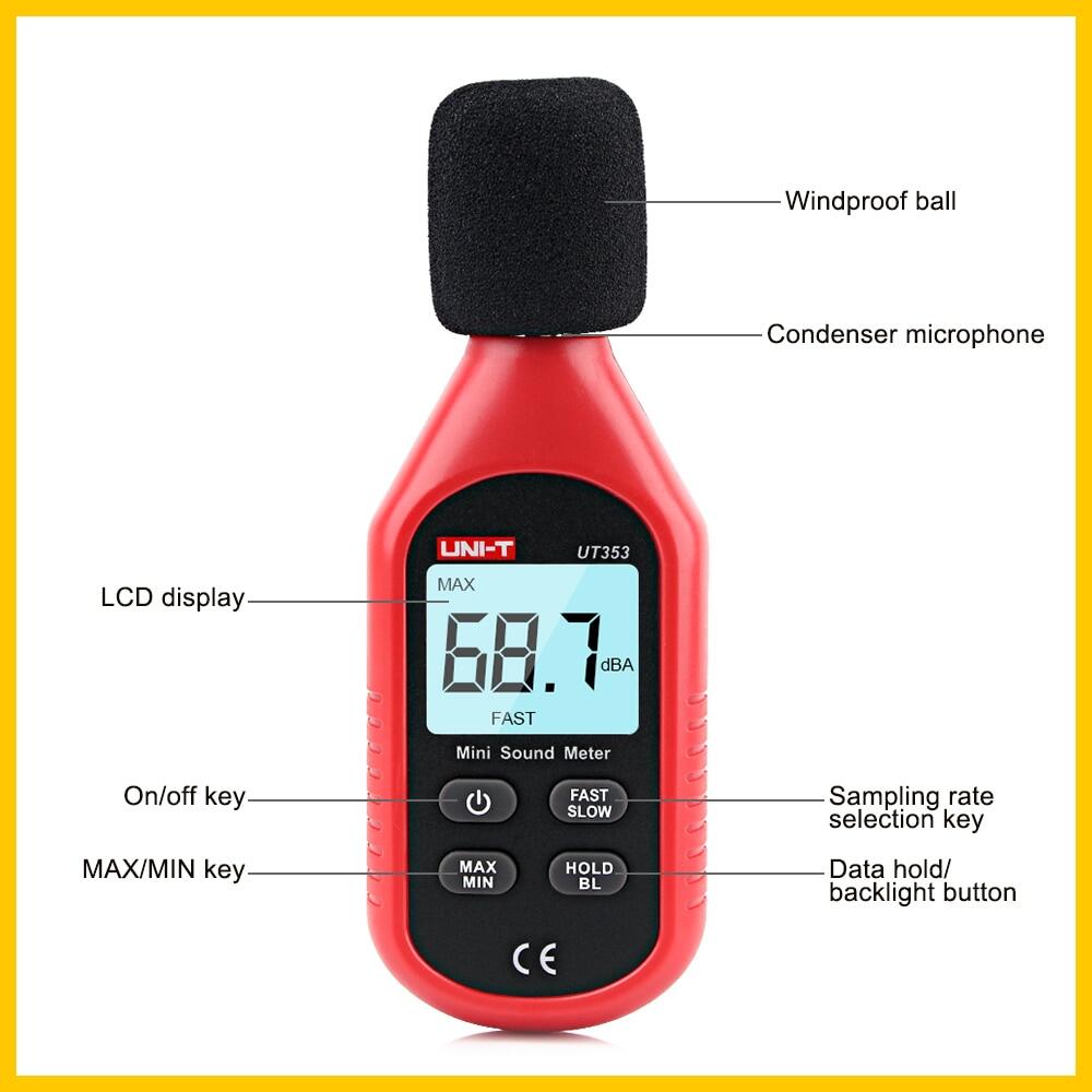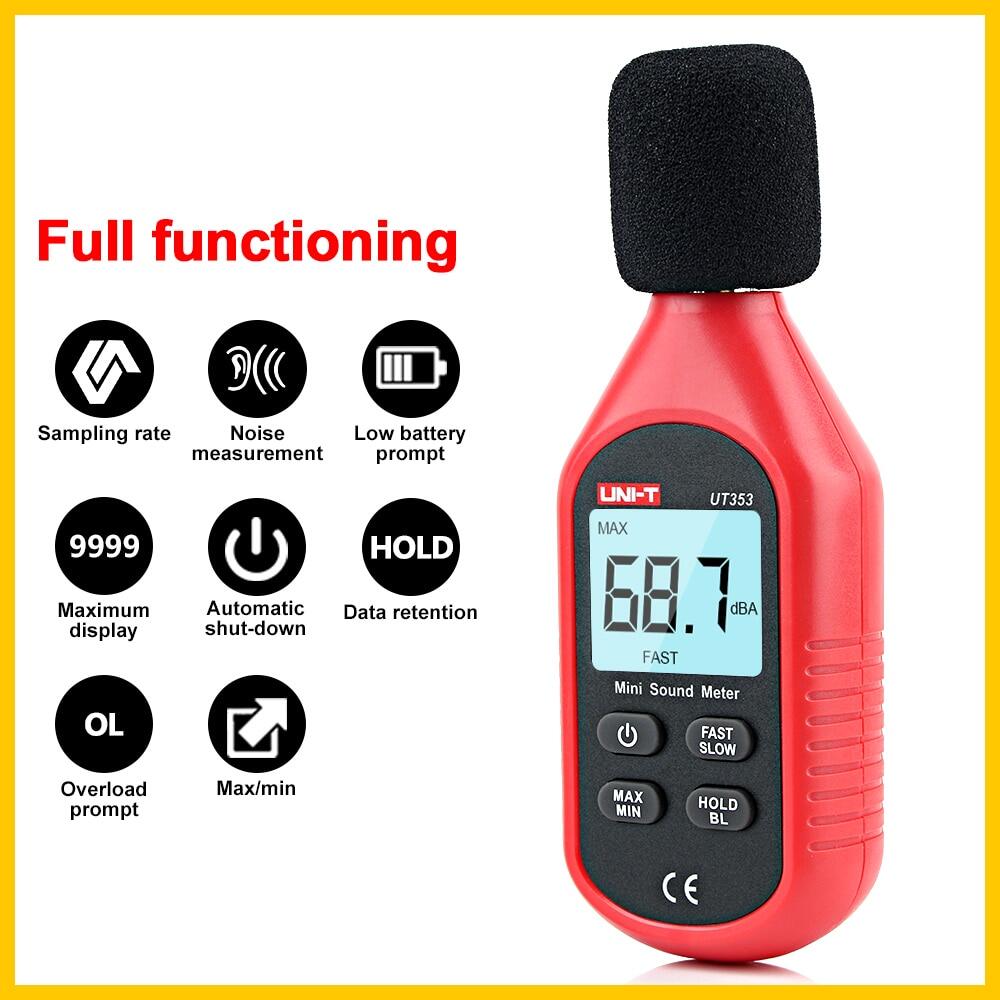 คุณสมบัติ UT353: 1.โหมดสูงสุด/นาที 2.ปิดเครื่องอัตโนมัติ (ยกเลิกได้) 3.เอาต์พุตสัญญาณอะนาล็อก ac/dc 4.การบ่งชี้เกิน/ภายใต้ช่วง 5.เก็บข้อมูลค้าง, LCD Backlight 6.แถบอะนาล็อกจำลอง 7.โหมดน้ำหนัก (หู)/C (เครื่อง) 8.เลือกช่วงคู่มือ/อัตโนมัติ 9.อัตราการตอบสนองเร็ว/ช้า (เร็ว: 125มิลลิวินาทีช้า: 1วินาที) 10.ใช้พลังงานจากแบตเตอรี่หรือแหล่งพลังงานภายนอก