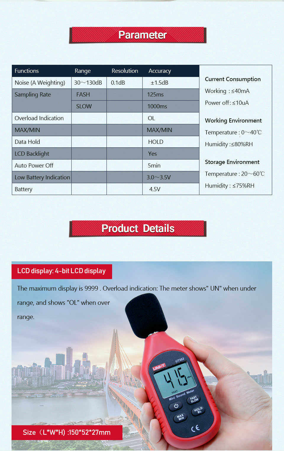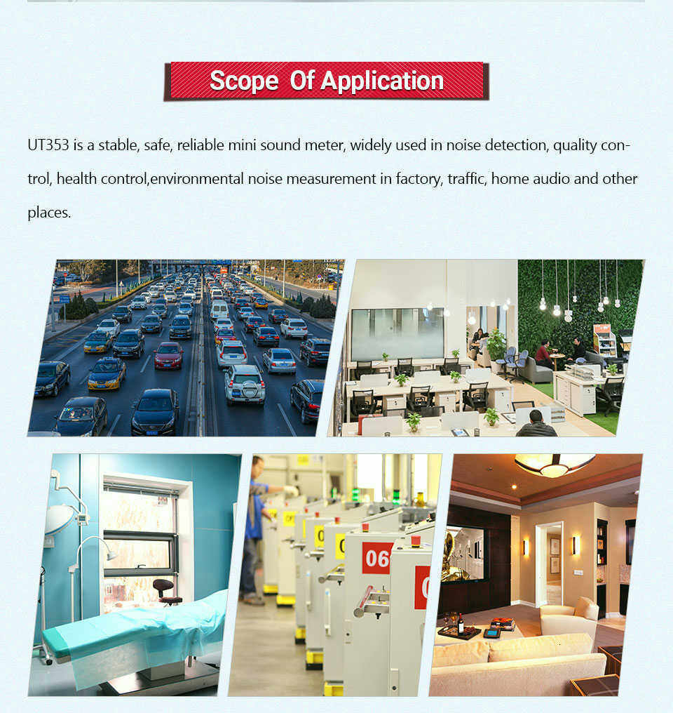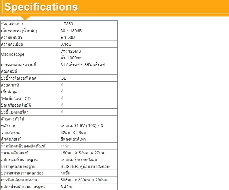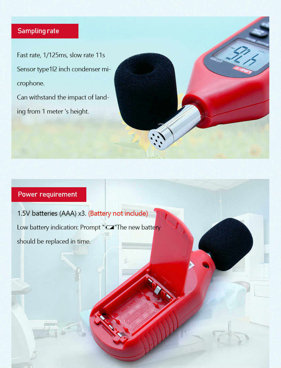 คุณสมบัติ UT353: 1.โหมดสูงสุด/นาที 2.ปิดเครื่องอัตโนมัติ (ยกเลิกได้) 3.เอาต์พุตสัญญาณอะนาล็อก ac/dc 4.การบ่งชี้เกิน/ภายใต้ช่วง 5.เก็บข้อมูลค้าง, LCD Backlight 6.แถบอะนาล็อกจำลอง 7.โหมดน้ำหนัก (หู)/C (เครื่อง) 8.เลือกช่วงคู่มือ/อัตโนมัติ 9.อัตราการตอบสนองเร็ว/ช้า (เร็ว: 125มิลลิวินาทีช้า: 1วินาที) 10.ใช้พลังงานจากแบตเตอรี่หรือแหล่งพลังงานภายนอก