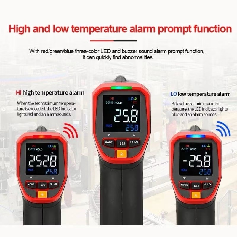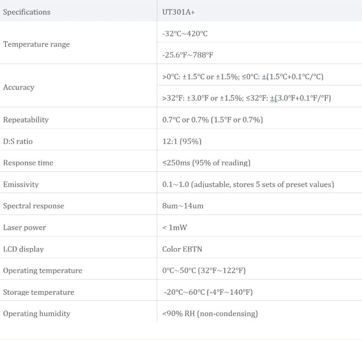 UT301A+ ซีรีย์เป็นเครื่องวัดอุณหภูมิอินฟาเรดที่ทนทานและใช้งานง่ายมีความแม่นยำ/พลังงาน (95%)/สามารถทำซ้ำได้ มันมีอุณหภูมิโมดูลสูงและต่ำที่ปรับได้ภาพ/เครื่องเตือนเสียงตอบสนองได้เร็วกว่า250MS ซึ่งสามารถช่วยคุณค้นพบความผิดปกติได้อย่างรวดเร็ว คุณสามารถกำหนดค่าและบันทึกค่า emissivity ได้5ชุดและเปลี่ยนค่า emissivity ตามพื้นผิวที่แตกต่างกันได้อย่างรวดเร็วเพื่อให้ได้ผลลัพธ์ที่แม่นยำได้รับเพิ่มเติม ด้วยการวัดล็อค, สูงสุด/นาที/เฉลี่ย/ที่ยึด, และขาตั้งกล้องสามขา, UT301A + เหมาะสำหรับกระบวนการที่ต้องใช้การตรวจสอบอุณหภูมิ UT301A + สามารถดัดแปลงเข้ากับการจ่ายพลังงาน/การตรวจสอบอุปกรณ์การขนส่ง, การบำรุงรักษา hvac/ อุปกรณ์, การแก้ไขปัญหายานพาหนะ, สาขาที่และอีกมากมาย